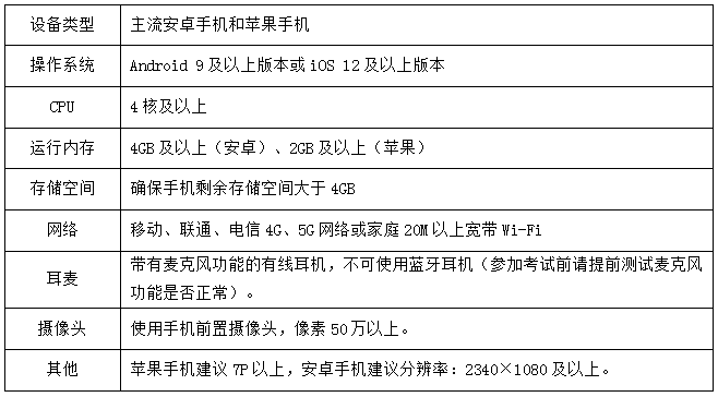 1.设备要求:考试支持计算机、Pad和手机3种设备类型,考生根据自身情况自备考试设备(至少1种),设备具体要求如下
